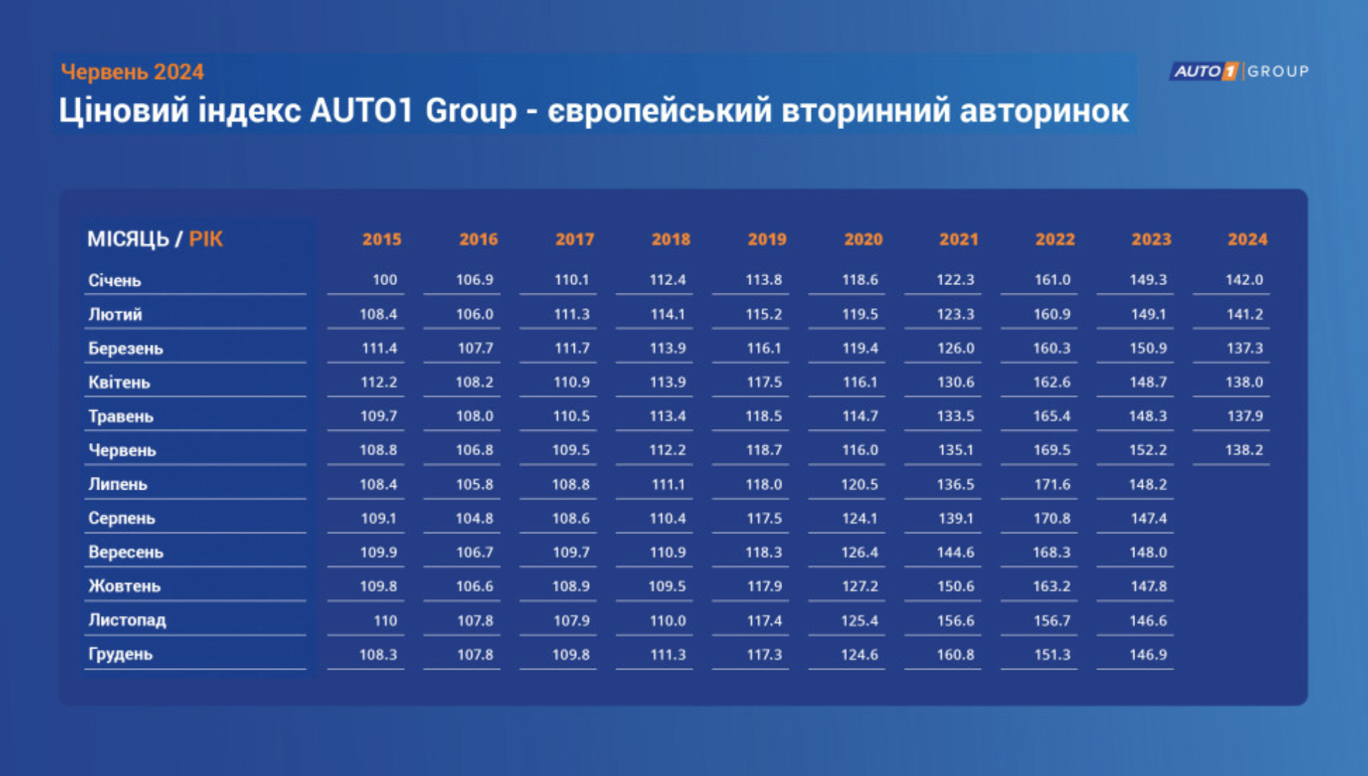 Індекс AUTO1 Group є важливим показником, що базується на аналізі понад 3,6 мільйона угод купівлі-продажу автомобілів з пробігом по всій Європі. Цей індекс використовується для визначення основних тенденцій на ринку вживаних автомобілів, що допомагає дилерам, покупцям та аналітикам робити обґрунтовані рішення щодо купівлі чи продажу транспортних засобів.